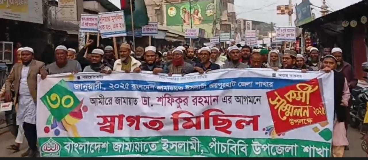 জয়পুরহাটে আমীরে জামায়াতের আগমন উপলক্ষ্যে পাঁচবিবি উপজেলা জামায়াতে ইসলামীর স্বাগত মিছিল ও পথসভা অনুষ্ঠিত
