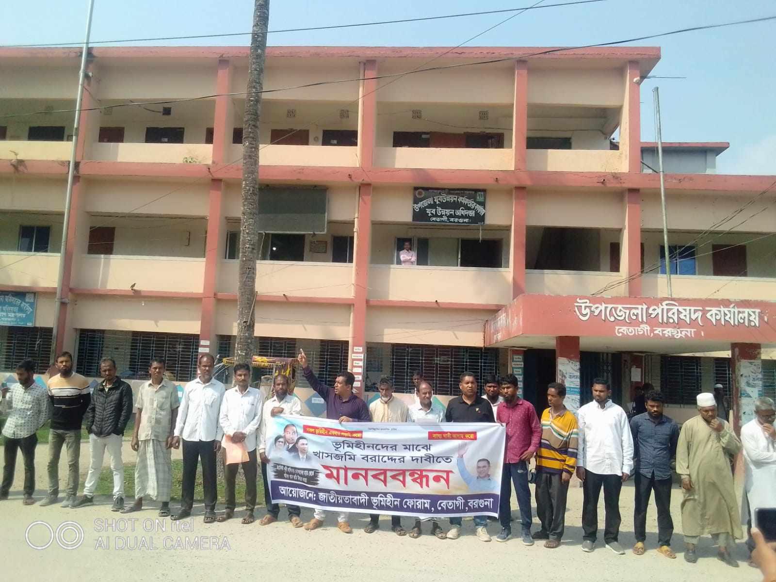 বরগুনা জেলার বেতাগীতে জাতীয়তাবাদী ভুমিহীন ফোরের উদ্যোগে মানববন্ধন। প্রভাব শালীর দখলে থাকা খাসজমি প্রকৃত ভূমিহীনদের মধ্যে বন্দোবস্তের দাবিতে মানববন্ধন প্রদান উপজেলার নির্বাহী অফিসারের কাছে স্মারকলিপি প্রদান করা হয়েছে। সকাল ১০টার দিকে উপজেলার পরিষদ সামনে ভূমিহীন ও অসহায় কৃষকের ব্যানারে এ কর্মসূচি পালন করা হয়। জাতীয়তাবাদী ভুমিহীন ফোরের পক্ষে বক্তব্য রাখেন, বেতাগী উপজেলা প্রেসক্লাবের সভাপতি ও উপজেলা বিএনপি’র যুগ্ন আহবায়ক মোঃরেজাউল করিম নেছার খান,তিনি বলেন বেতাগীর বিপুল পরিমাণ খাস সম্পত্তি রয়েছে। প্রকৃত ভূমিহীন না হলেও ক্ষমতার প্রভাব খাটিয়ে বিলের খাস সম্পত্তি দীর্ঘদিন ধরে ভোগদখল করেছেন প্রভাব শালীরা। বিষয়টি তদন্তসহ প্রভাব শালীদের চিহ্নিত করে লিজ বাতিলসহ প্রকৃত ভূমিহীনদের মধ্যে খাসজমি বন্দোবস্তের ব্যবস্থা গ্রহণে প্রশাসনের প্রতি দাবি জানানো হয়।