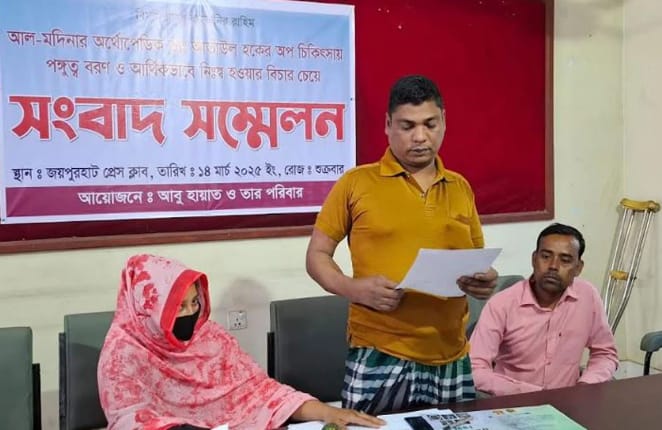 জয়পুরহাটে চিকিৎসকের অপচিকিৎসায় পঙ্গুত্ববরণ করা ভুক্তভোগীর সংবাদ সম্মেলন