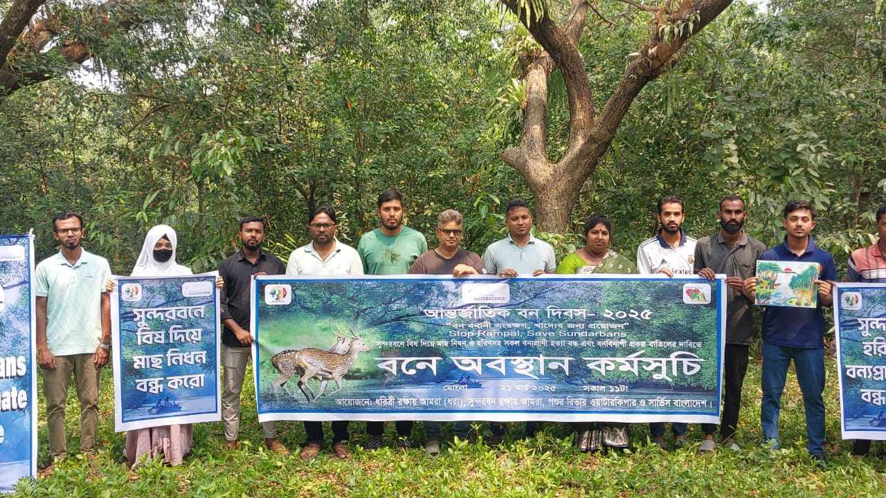 সুন্দরবন রক্ষায় দূষণরোধ ও বন্যপ্রাণী অপরাধ দমন করতে হবে। সুন্দরবনের নদী খালে বিষ দূষণকারী ও হরিণ শিকারীরা বেপরোয়া হয়ে উঠেছে। ভূমি দস্যুদের আগ্রাসী মনোভাবের কারনে সুন্দরবনের আয়তন ছোট হয়ে আসছে। রামপাল বিদ্যুৎকেন্দ্র’র কয়লা দূষণেও পশুর নদ এবং সুন্দরবন আক্রান্ত। বন্যপ্রাণী অপরাধ দমন এবং বনবিনাশী প্রকল্প ও কার্যক্রম বন্ধ করতে না পারলে সুন্দরবনের অস্তিত্ব থাকবেনা। ২১ মার্চ শুক্রবার সকালে আন্তর্জাতিক বন দিবস উপলক্ষে মোংলা সরকারি কলেজের ম্যানগ্রোভ বনে সুন্দরবনে বিষ দিয়ে মাছ নিধন ও হরিণ শিকারসহ সকল বন্যপ্রাণী হত্যা বন্ধ এবং বনবিনাশী প্রকল্প বাতিলের দাবিতে অবস্থান কর্মসুচি পালিত হয়। ধরিত্রী রক্ষায় আমরা (ধরা), সুন্দরবন রক্ষায় আমরা, পশুর রিভার ওয়াটারকিপার ও সার্ভিস বাংলাদেশ’র আয়োজনে এ অবস্থান কর্মসুচি পালিত হয়।