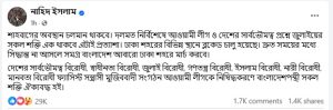 স্ট্যাটাসে নাহিদ ইসলাম লেখেন, শাহবাগের অবস্থান চলমান থাকবে। দলমত নির্বিশেষে আওয়ামী লীগ ও দেশের সার্বভৌমত্ব প্রশ্নে জুলাইয়ের সকল শক্তি এক থাকবে—এটাই প্রত্যাশা। ঢাকা শহরের বিভিন্ন স্থানে ইতিমধ্যেই ব্লকেড চালু হয়েছে। দ্রুত সময়ের মধ্যে সিদ্ধান্ত না এলে সমগ্র বাংলাদেশ আবারো ঢাকা শহরে মার্চ করবে।