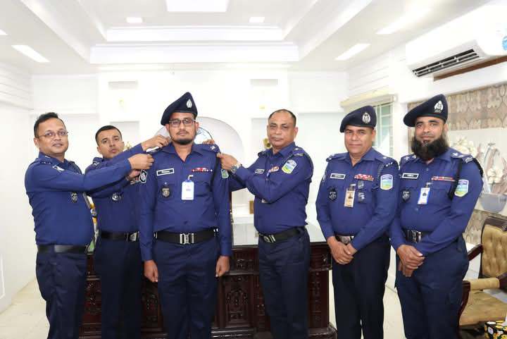 পদোন্নতি প্রাপ্ত পুলিশ সদস্যকে র্যাংক ব্যাজ পরিধান করালেন শেরপুর পুলিশ সুপার