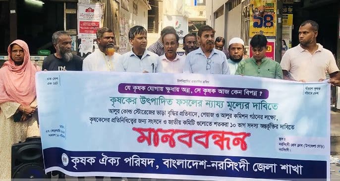 নরসিংদীতে ১০ দফা দাবি আদায়ের লক্ষ্যে কৃষকদের মানববন্ধন।