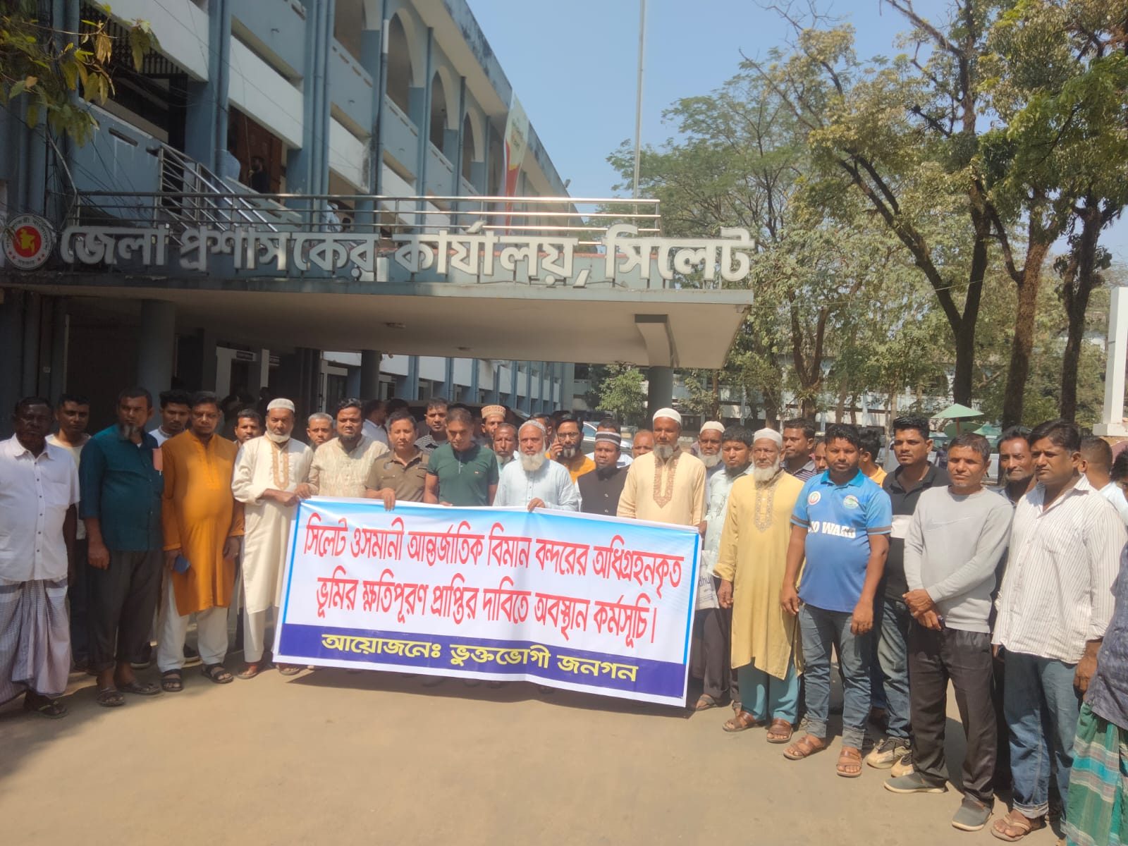 ওসমানী বিমানবন্দরে অধিকৃত ভূমির টাকা প্রাপ্তির দাবিতে জেলা প্রশাসক কার্যালয়ের সামনে ভুক্তভোগীদের অবস্থান