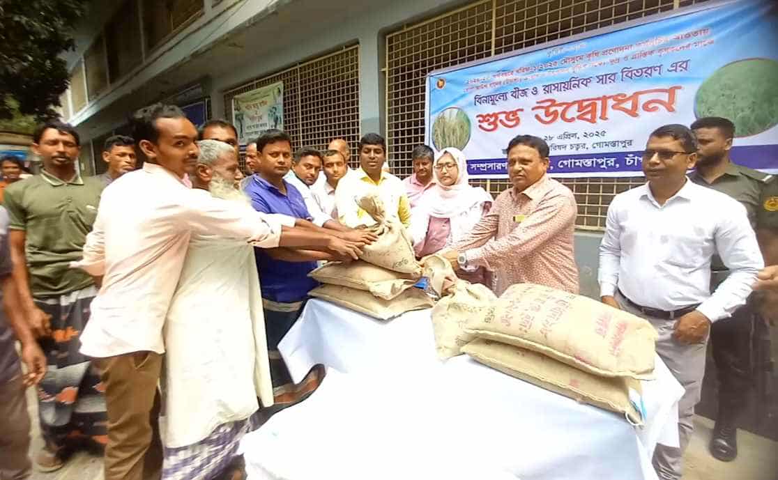 গোমস্তাপুরে ক্ষুদ্র ও প্রান্তিক কৃষকের মাঝে বিনামূল্যে ধান বীজ ও রাসায়নিক সার বিতরণের উদ্বোধন