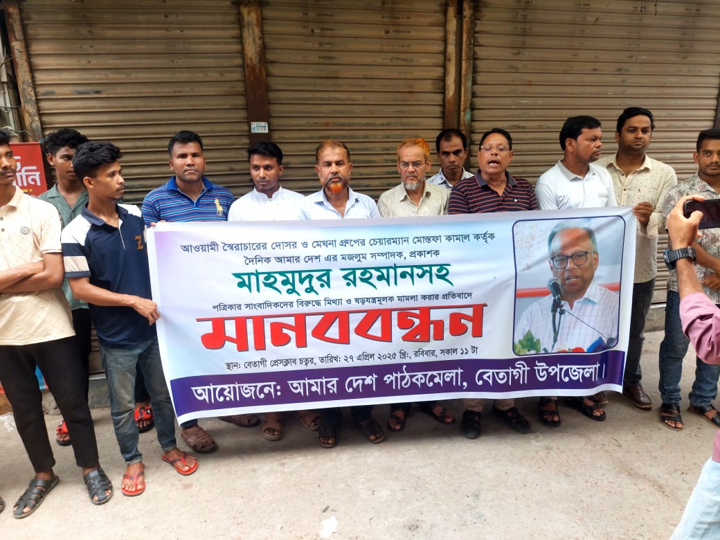 বেতাগীতে আমার দেশ পাঠকমেলার মানববন্ধন, মোস্তফা কামালের গ্রেপ্তার ও মাহমুদুর রহমানের বিরুদ্ধে মামলা প্রত্যাহারের দাবি