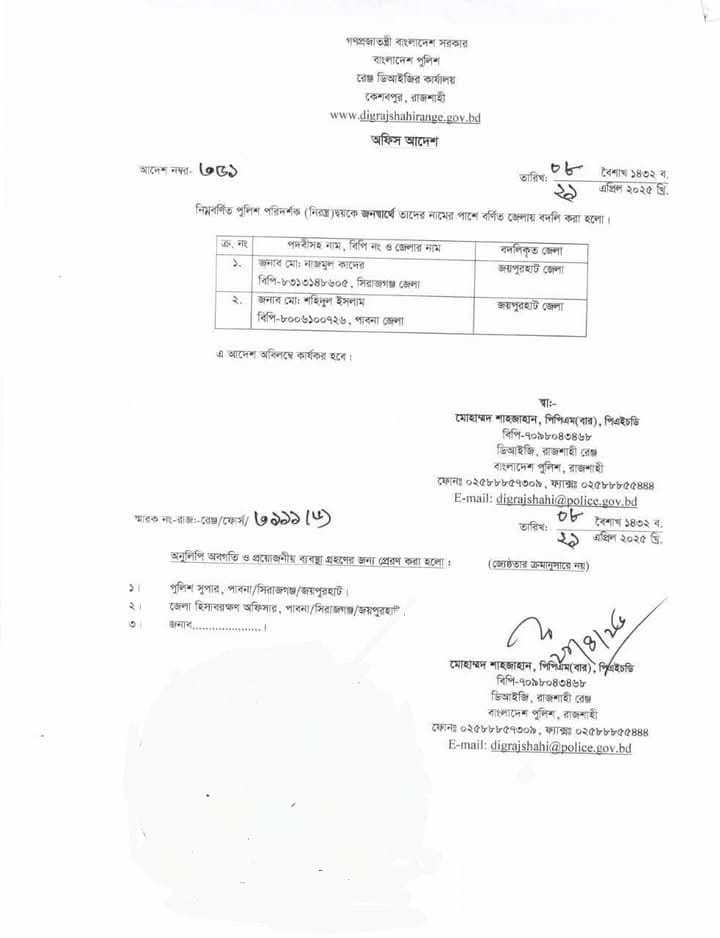 ঈশ্বরদী থানার অফিসার ইনচার্জ (ওসি) শহিদুল ইসলামের বদলী আদেশ!